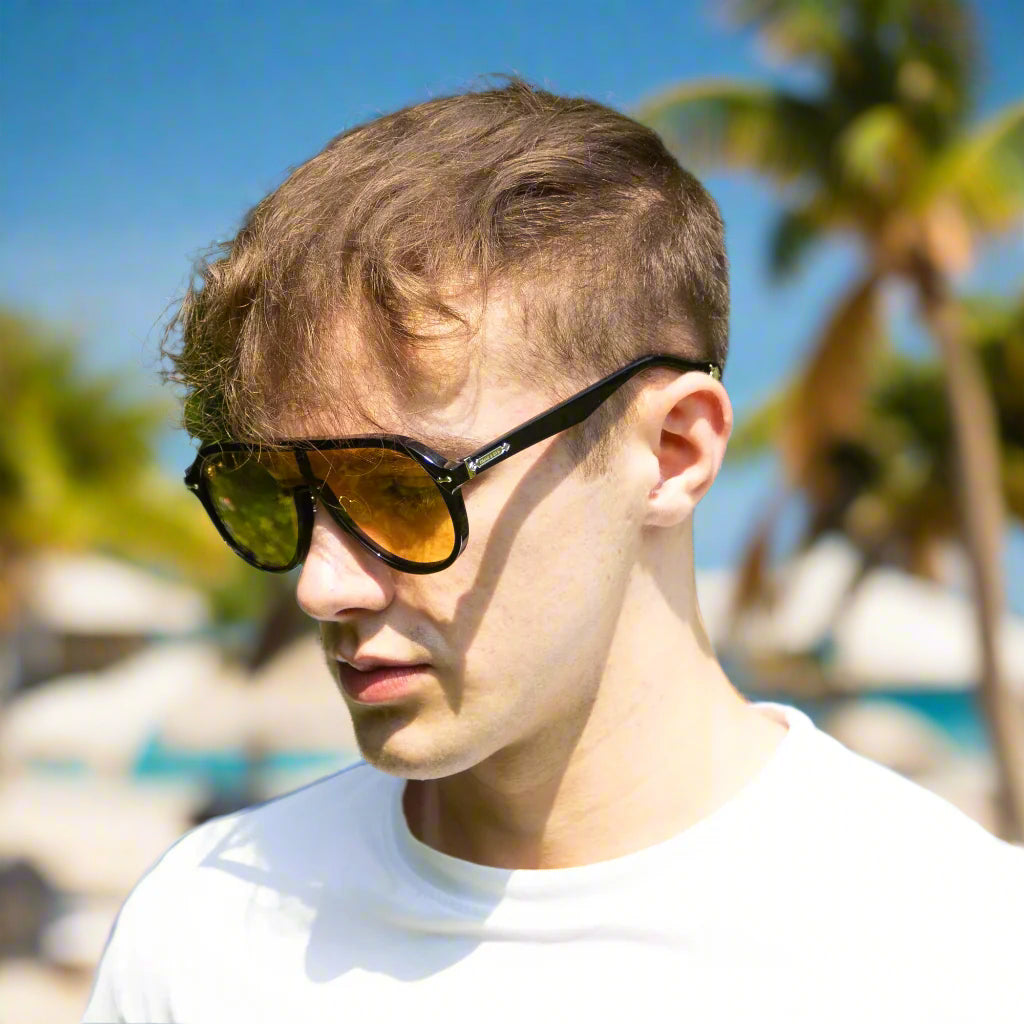 Paignton - Our thick retro inspired Aviator style frame handcrafted from premium Italian acetate with comfortable nose pads and detail motifs with a branded crest on the tips, complimenting a heart, oval and round shaped face fitted with 100% UV protection lenses.
