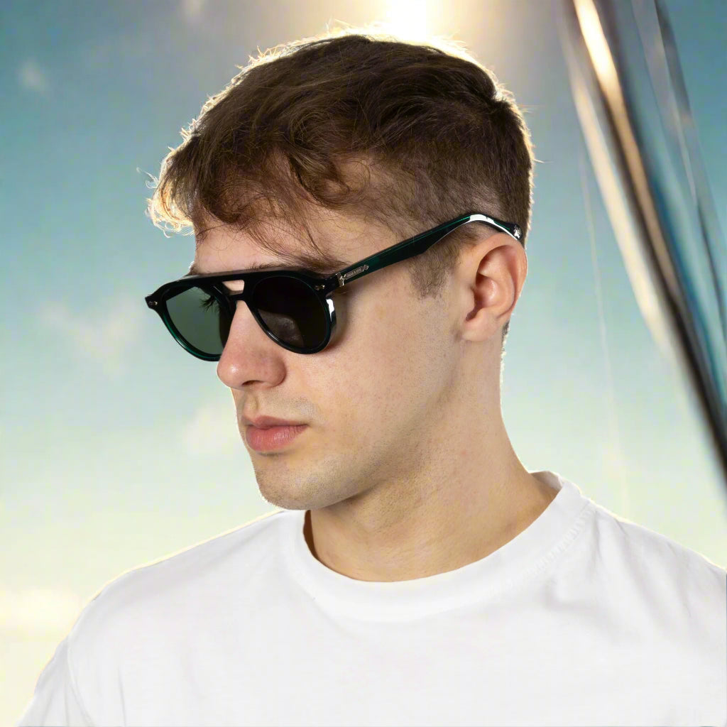 City - Round faced vintage themed handcrafted from premium Italian acetate, with a comfortable key hole nose bridge, a thick sharp fitting design for the city dweller with added details on the temple and a branded crest on the tips fitted with 100 % UV protection lenses.