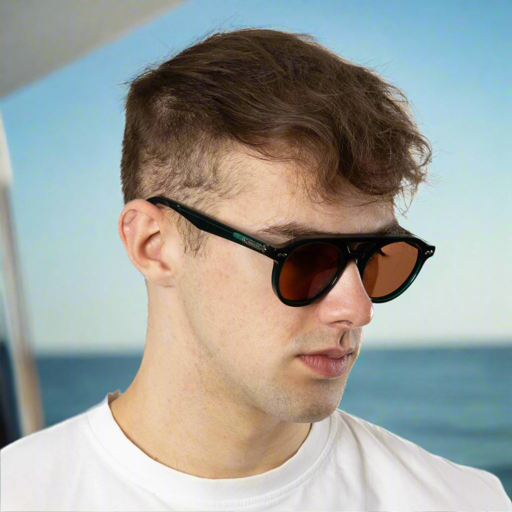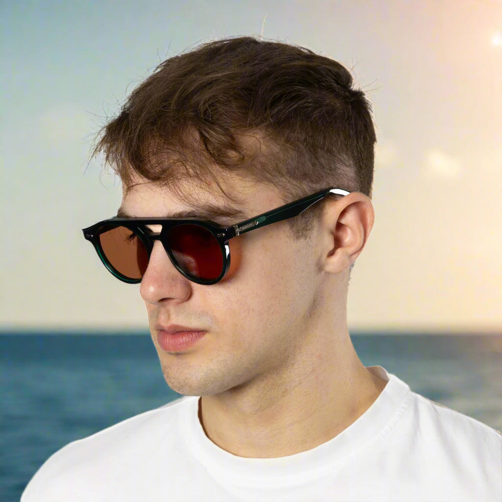 City - Round faced vintage themed handcrafted from premium Italian acetate, with a comfortable key hole nose bridge, a thick sharp fitting design for the city dweller with added details on the temple and a branded crest on the tips fitted with 100 % UV protection lenses.